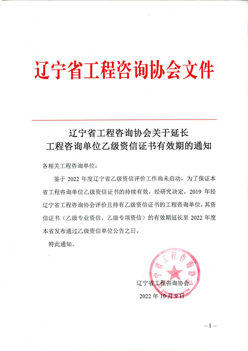 遼寧省工程咨詢協(xié)會(huì)關(guān)于延長(zhǎng)工程咨詢單位乙級(jí)資信證書有效期的通知