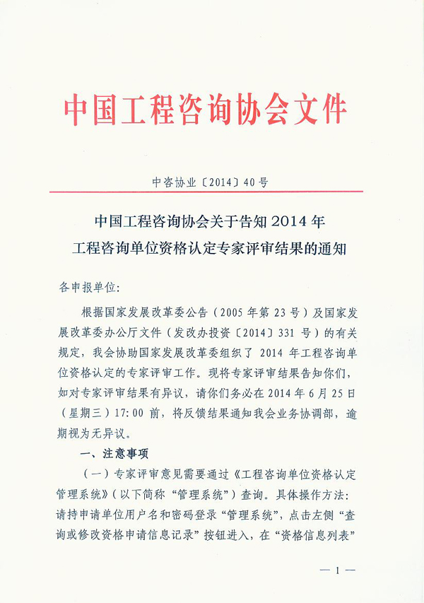 中國工程咨詢協(xié)會關(guān)于告知2014年工程咨詢單位資格認定專家評審結(jié)果的通知