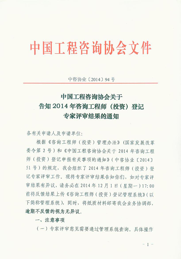 中國工程咨詢協會關于告知2014年咨詢工程師(投資)登記專家評審結果的通知