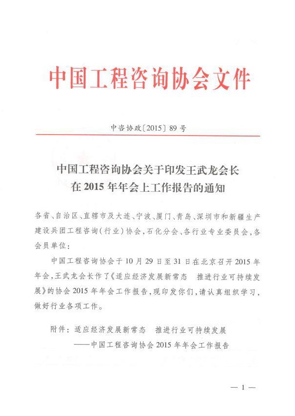 中國工程咨詢協(xié)會關(guān)于印發(fā)王武龍會長在2015年年會上工作報(bào)告的通知