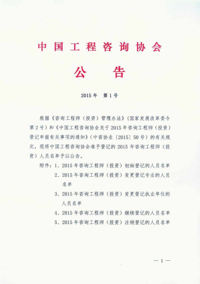 中國工程咨詢協會公告2015年第1號