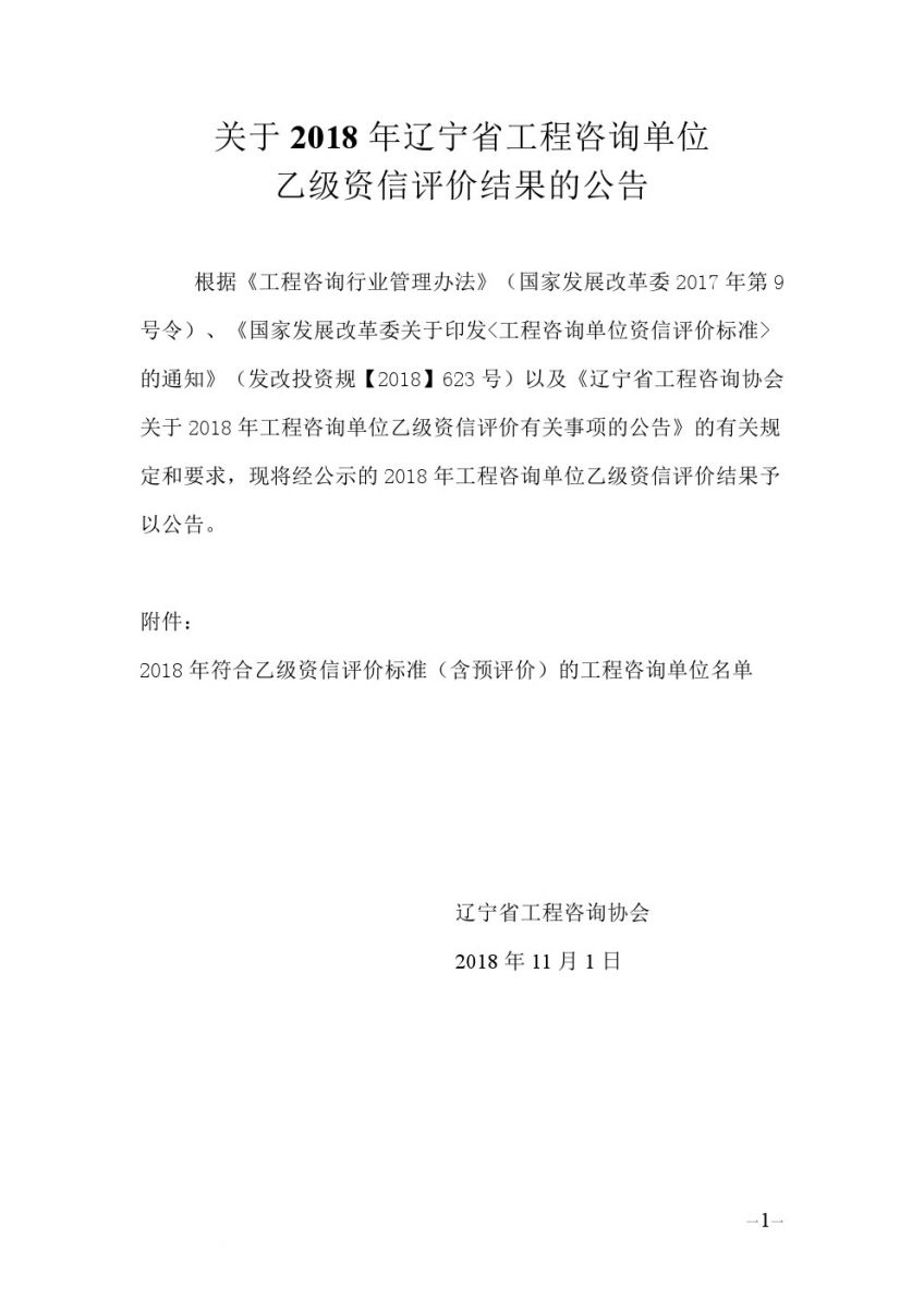 遼寧省2018年工程咨詢單位乙級資信評價(含預評價)結果公示